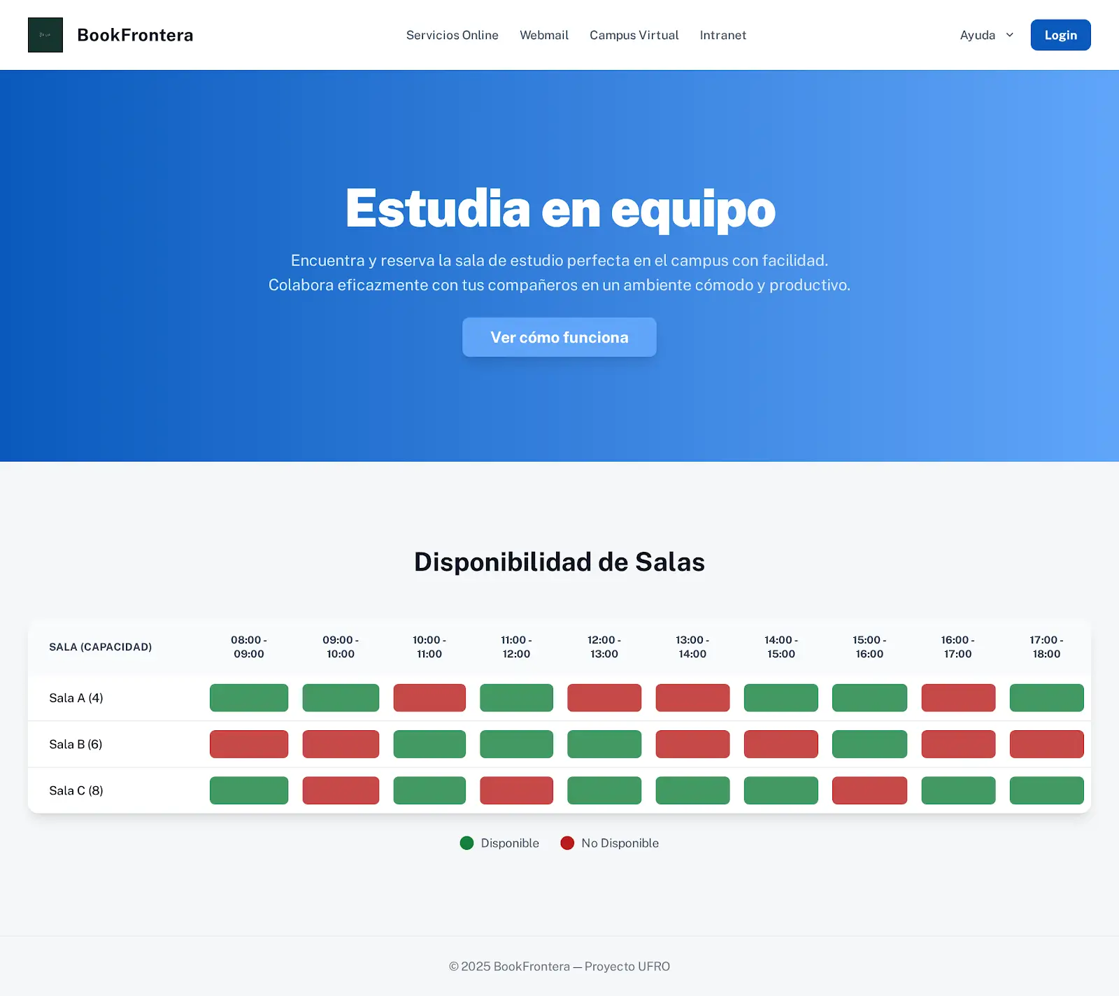 Plataforma de reservas para estudiantes de la UFRO. Permite reservar salas de estudio solo a estudiantes con correo @ufromail.